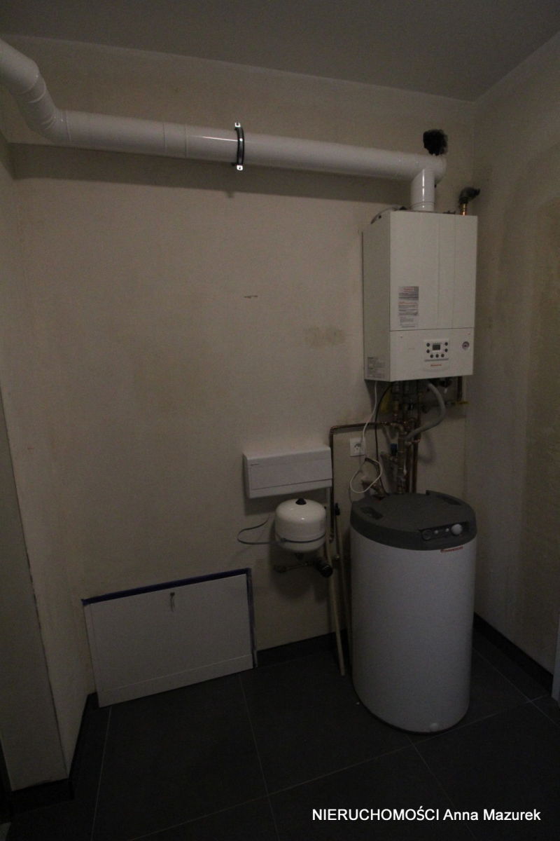 z bramą wjazdową sterowaną elektrycznie, jednostanowiskowy o pow. 22m2. Podłoga wyłożona płytkami. Za garażem znajduje się pomieszczenie gospodarcze (kotłownia), w której mamy rozdzielnię ogrzewania podłogowego, piec gazowy oraz bezpośrednie wyjście na ogród.