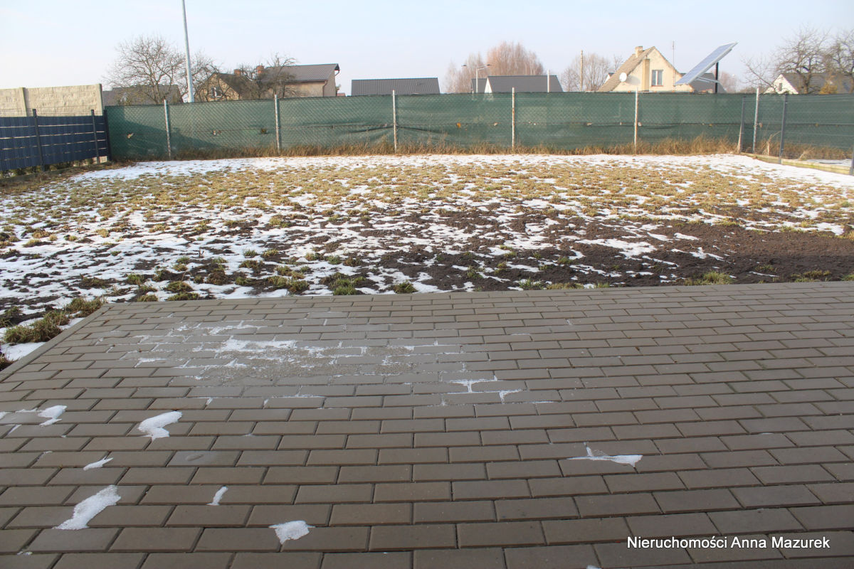 Od strony frontowej budynku mamy teren zielony otwarty a dojście do domu oraz podjazd do garażu wyłożone kostką brukową.