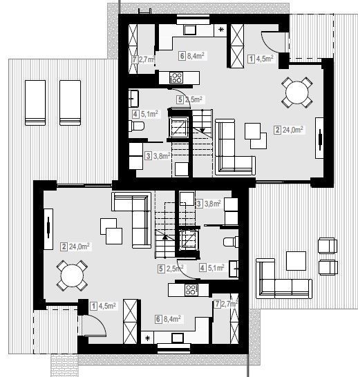 Każdy dom położony na odrębnej działce o powierzchni około 400m2.