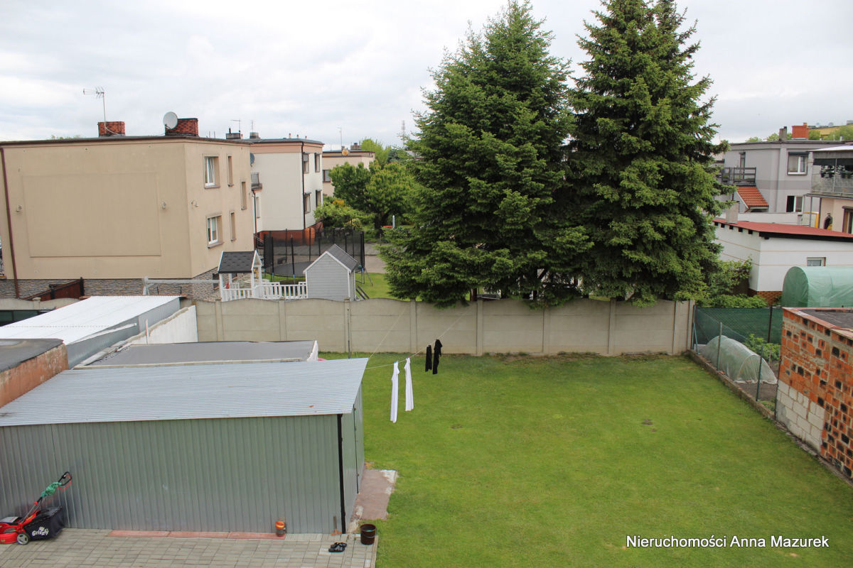 W tylnej części działki posadowiony blaszany garaż a pozostała wolna powierzchnia obsiana trawą.